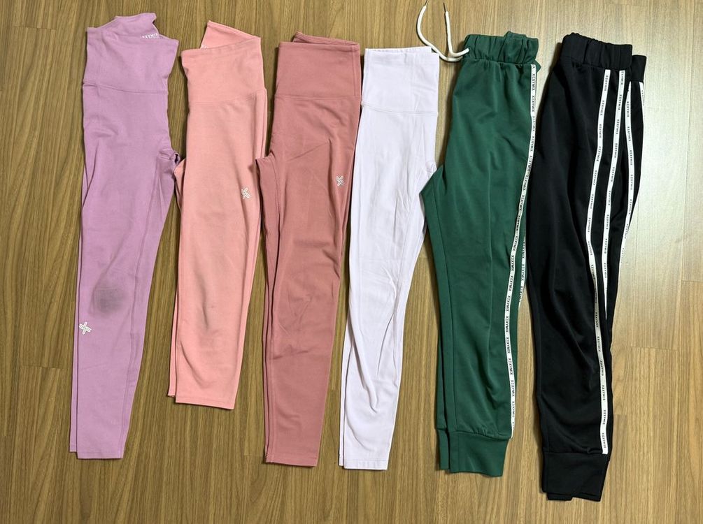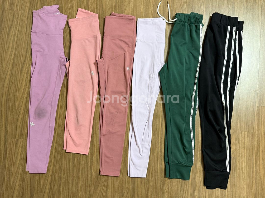 젝시믹스 레깅스 M사이즈 일괄 판매합니다. 왼쪽 라벤더 색상, 핑크색 레깅스에는 운동으로 인한 이염이 있습니다. 왼쪽으로부터 3,4 번 레깅스는 안쪽이 기모에요. 다만 4번은 뮬라웨어 제품으로 기모에 겉감은 매우 부드러워요. 예민하신 분들은 스킵해 주세요. 운동 많이 하시고 세탁 자주 못하시는 분들이 가져가시면 좋을듯하네요.