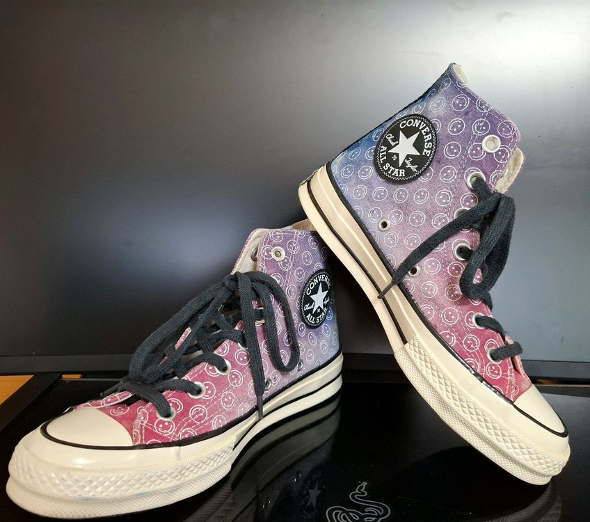 컨버스 척70 하이 스마일리 240사이즈입니다. 독특한 스마일리 패턴이 매력적인 제품입니다. 실착 횟수 3회정도로 깨끗한 상태 유지하고 있습니다. 오랜만에 신발장에서 꺼내서 새척을 한번 했는데 물이 빠졌습니다 하지만 빈티지 워싱 들어간거처럼 예쁘게 빠진거 같기도 하네용 박스는 없는 상태입니다 정가8만원주고 구매하였습니다 문의 없으면 바로 결제 해주시면 됩니다!