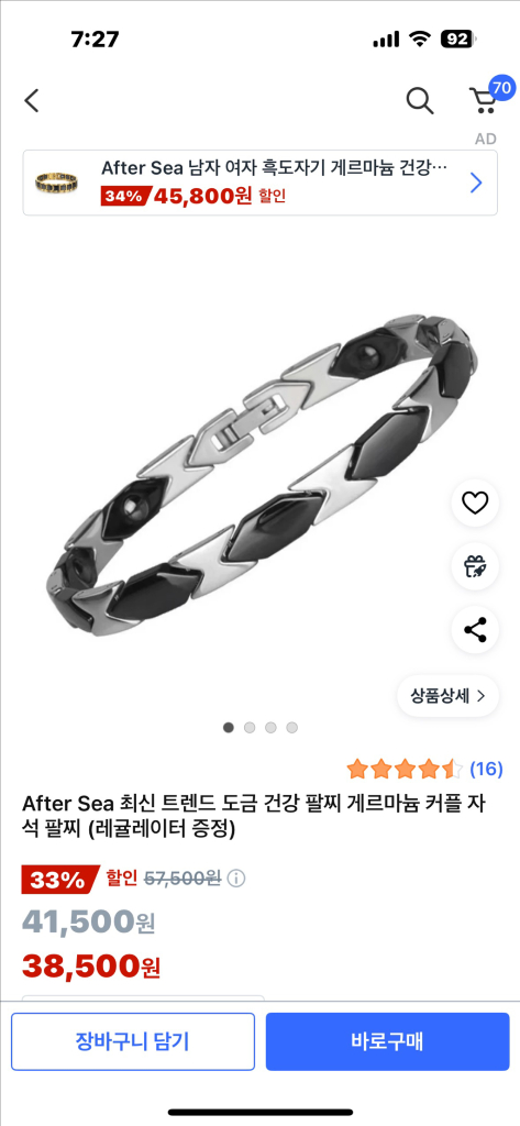 fter Sea 최신 트렌드 도금 건강 팔찌 게르마늄 커플 자 석팔찌 혈행개선 통증완화 체질개선 절임예방 건강팔찌 교환환불불가