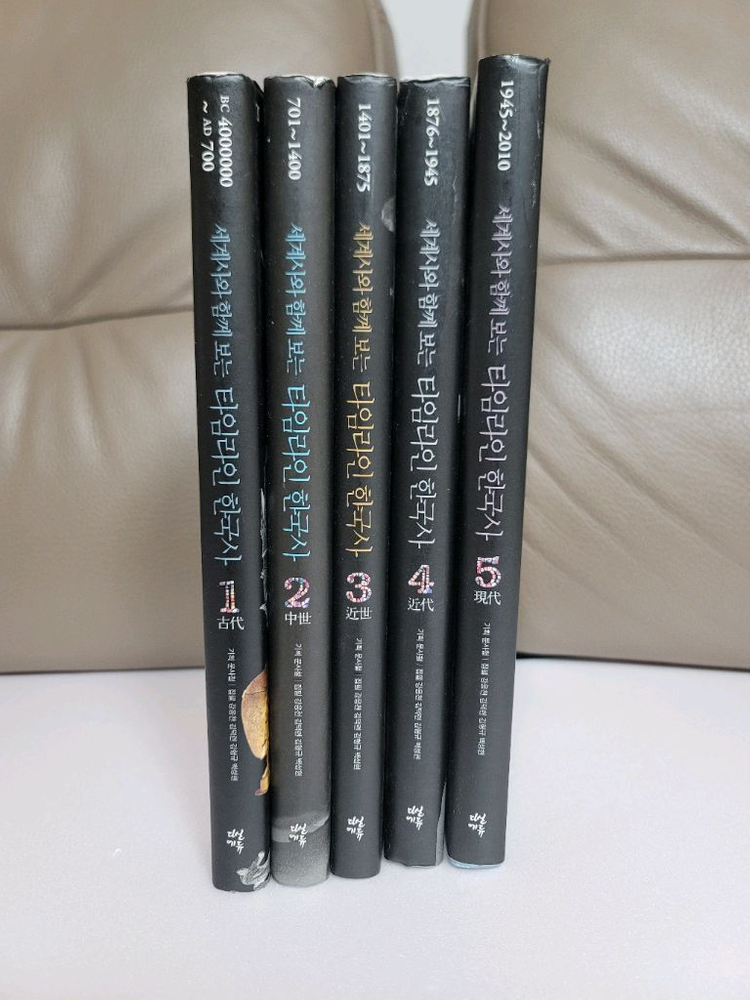 타임라인 한국사 전집 5권 세트입니다. 책 상태가 깨끗하고 내부 페이지도 양호해요. 한국사 공부나 교양 독서용으로 좋을 것 같아요.