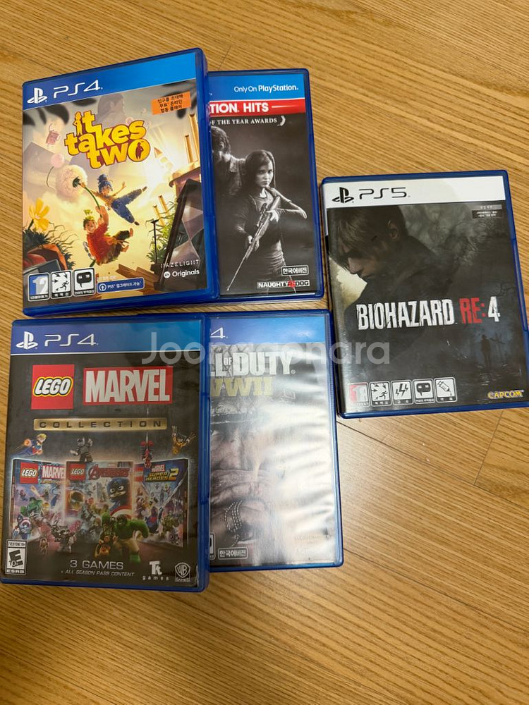 개인정보(거래정보)를 주고받는 행위는 사기에 노출될 수 있으므로 즉시 중고나라로 신고해 주세요PS4와 PS5용 게임 5개를 판매해요. 잇테이크투 2.5만 라오어 1만 레고마블컬렉션 판완 바이오해저드 re4 3만 콜오브듀티 월드워2 4만 택배 착불, 3개이상 구매시 무료배송 청주오창 직거래 가능