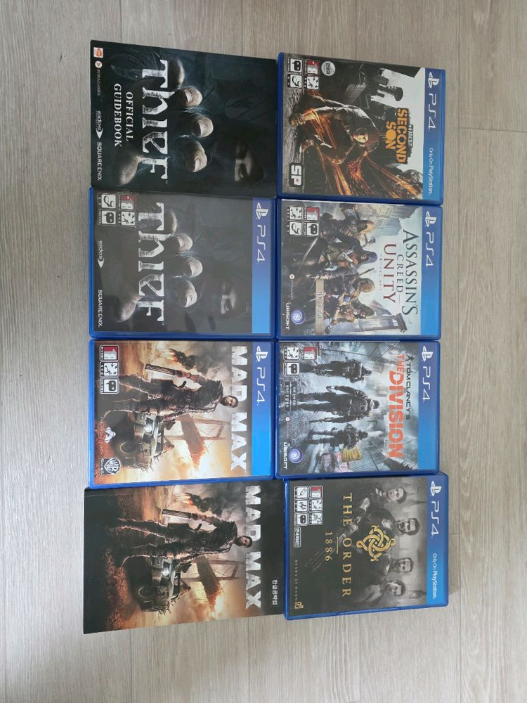 PS4 게임 타이틀 일괄 판매합니다 - Thief (공략본 포함) - Assassin's Creed Unity - Mad Max (공략본 포함) - The Division - The Order: 1886 용인 직거래 택배 가능합니다.