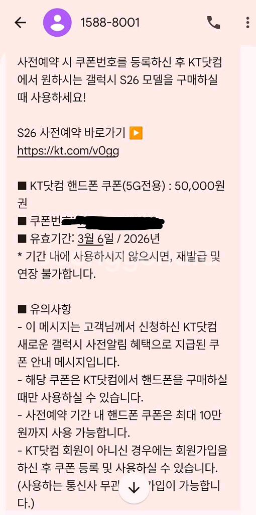개인정보(거래정보)를 주고받는 행위는 사기에 노출될 수 있으므로 즉시 중고나라로 신고해 주세요■ KT닷컴 핸드폰 쿠폰(5G전용) : 50,000원권 ■ 쿠폰번호: ■ 유효기간: 3월 6일 / 2026년 * 환불 불가 * 기간 내에 사용하시지 않으시면, 재발급 및 연장 불가합니다.