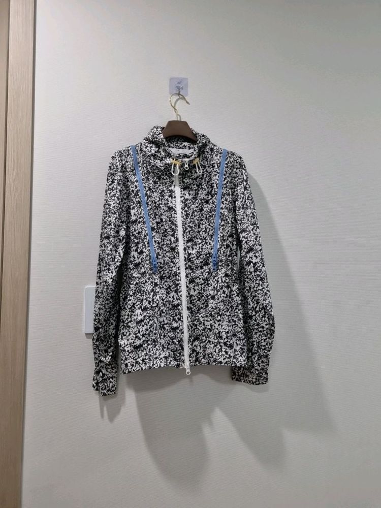 스텔라 맥카트니 콜라보 아디다스 바람막이 점퍼입니다. 흑백 패턴에 하늘색 포인트가 들어가서 예뻐요. 런닝할 때 뿐만 아니라 평상시에도 입기 좋은 스타일입니다. 사이즈 90 가단52총장61 상태아주좋아요