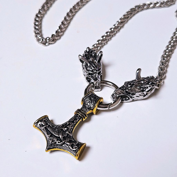 제가 파는 다른 상품이랑 같이 하시면 [에눌] 해드립니다 한번도 착용 안한 새상품입니다 늑대가 굉장히 멋있고 망치무늬가 독특한 제품입니다 실버색상이고 체인도 두껍고 튼튼해요 그냥 머리 통과해서 편하게 착용하면 됩니다 꽤 무게가 나가서 묵직해요 목걸이둘레 60cm 체인두께 6mm 망치 펜던트크기 가로 3.3cm 세로 4.5cm