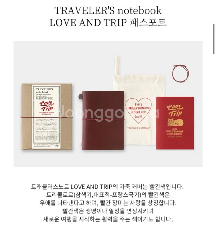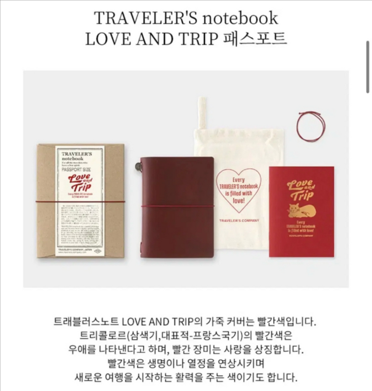 트래블러스 노트 LOVE AND TRIP 레드 색상입니다 소가죽 커버로 제작되었고, 코튼 파우치가 포함되어 있습니다. 앞으로 구하기도, 구할수도 없는 고급 레드 컬러의 트래블러스 노트. 그것도 패스포트 사이즈. 어짜피 팔 생각 없기도 하고 조만간 그냥 제가 쓸까도 생각중이라 올려놔봅니다. 택배거래만 가능.