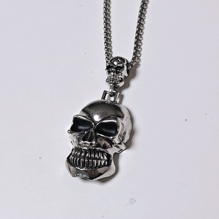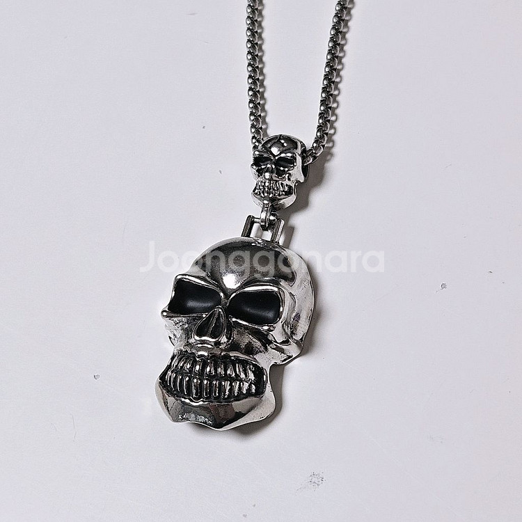 제가 파는 다른 상품이랑 같이 하시면 [에눌] 해드립니다 체인 튼튼하고 독특한 해골 실버 색상 목걸이입니다 한번도 안 쓰고 모셔만 둬서 실기스 하나 없는 새거입니다 목걸이둘레 58cm 펜던트 가로 2.5cm 세로 5cm