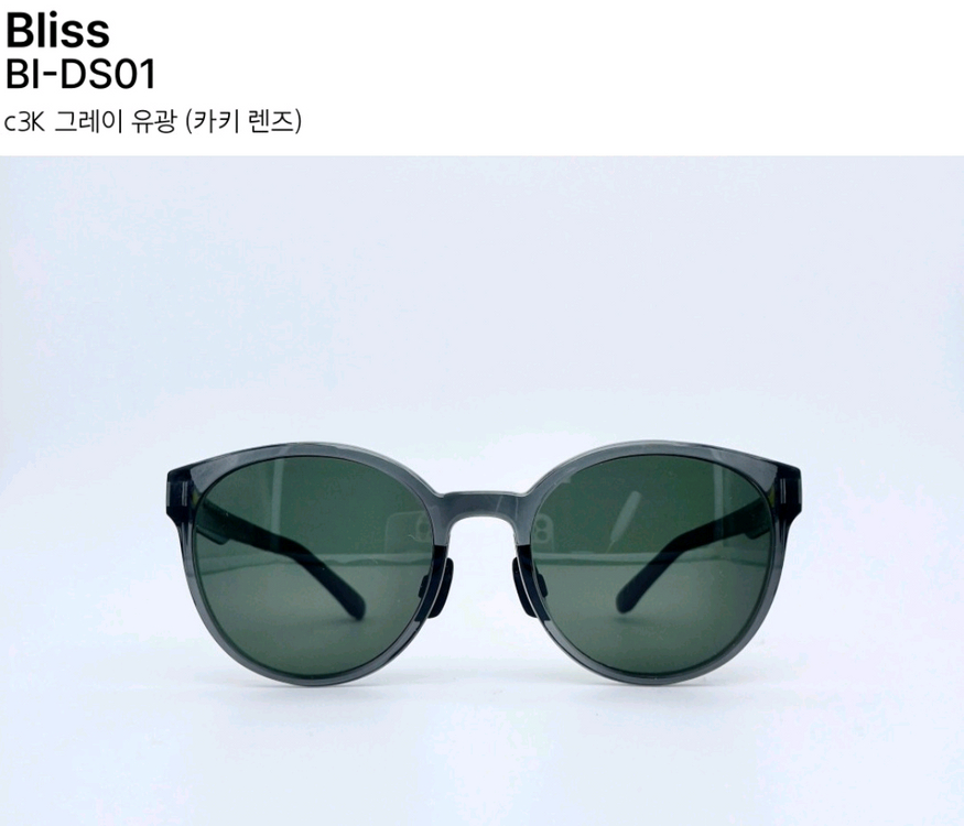 블리스 bliss 선글라스 DS01 그레이바디 + 카키 렌즈 메이드인 코리아 자외선 차단 999 오버핏 디자인 코받침에 도톰한 실리콘 쿠션이 있어서 흔들림없이 착 붙습니다. 편광 선글라스로 정말 가볍고 착용감 좋아요. 운동용, 아웃도어용으로 강추! 시커먼 올블랙이 아니라서 캐주얼한 느낌이에요. 안경점에서 25만원에 구입하고 실제로 착용하고 외출해보지 않았어요. 시착만 한 제품 입니다. 전용 케이스 같이 드려요.