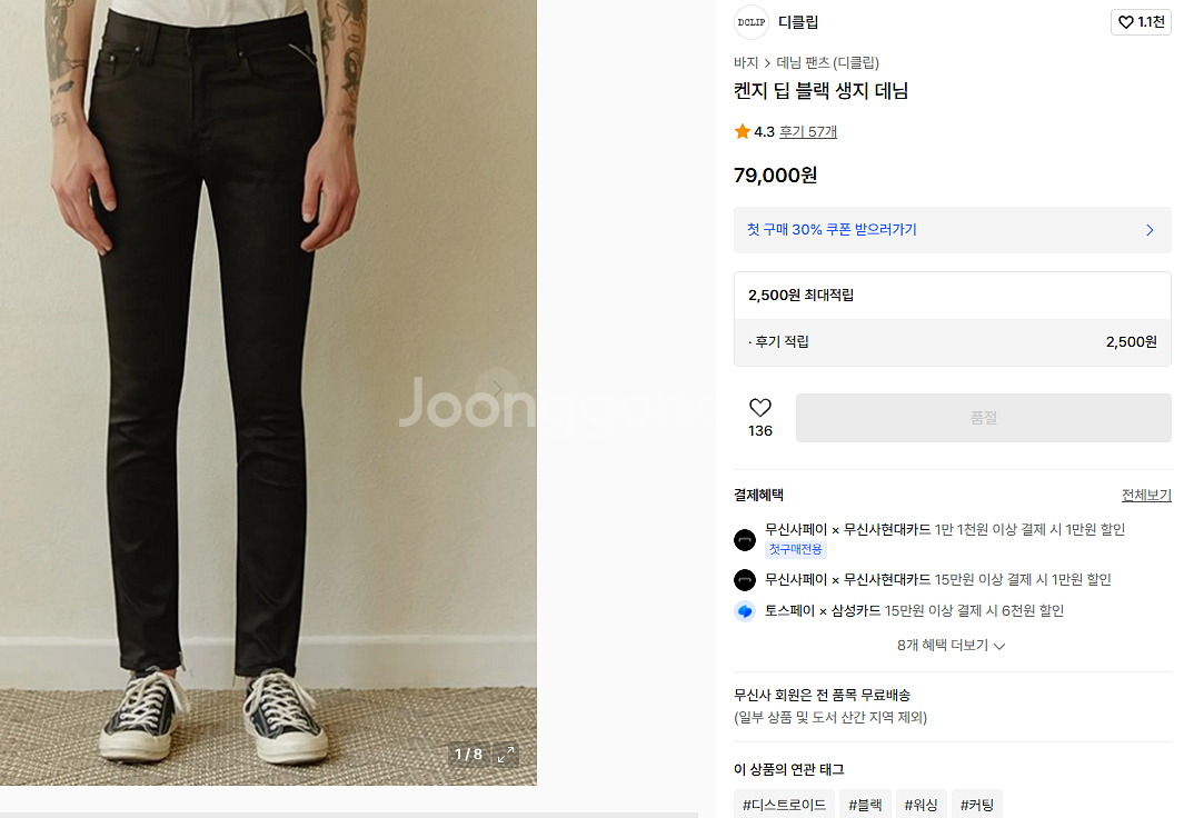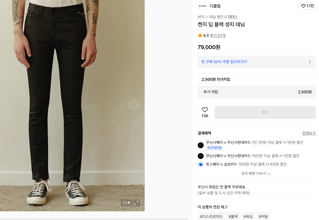 디클립 슬림핏 블랙진 급처 사이즈 29 총장 86cm 상태 극상 단종 상품