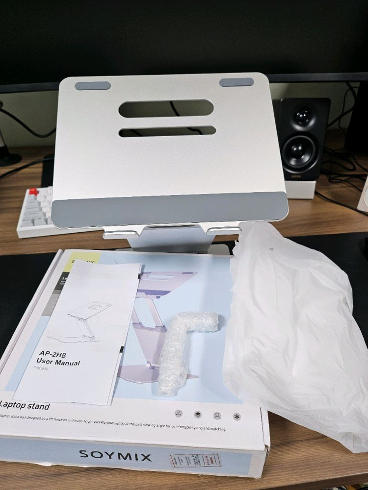 25년 6월 18일에 구매했고 퇴사 전에 쓰던거라 실사용은 3개월정도입니다. 구성품 다있고 강도 조절 렌치는 한번도 안써서 포장도 안뜯겨 있습니다. 노트북 거치대 여러개 써봤지만 노트북 거치로만 보면 제일 좋습니다. 3번 사진처럼 2단이라 높이조절도 용이하고, 고정이 엄청 잘됩니다.