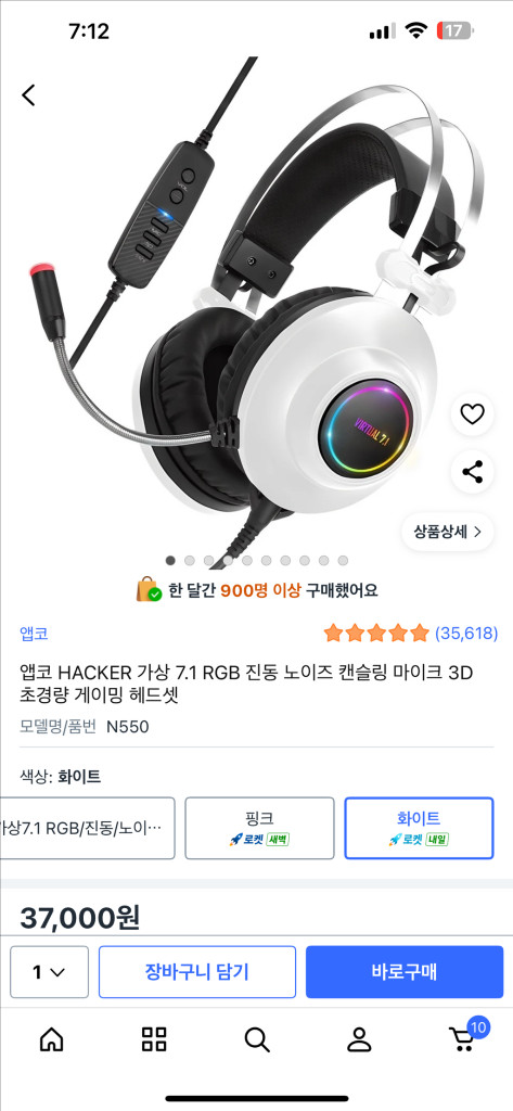 RGB 조명 기능과 노이즈캔슬링 기능이 있는 고급형 게이밍 헤드셋이에요. 화이트와 블랙 컬러로 깔끔하고 RGB 조명이 멋스럽네요. 상태 양호한 중고 제품입니다. 실사용2달