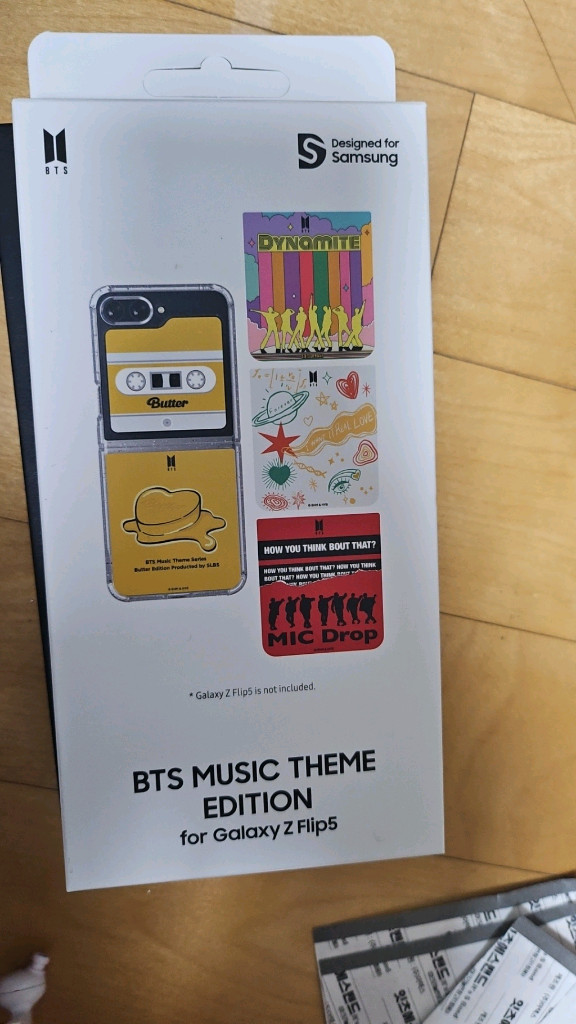 BTS 랑 삼성 콜라보 상품이에요 새 상품이고 에눌 가능합니다 z플립 5에만 가능하고 소장용으로도 구매 가능하세요 정식 명칭은 BTS MUSIC THEME EDITION for Galaxy Z Flip5 입니다.