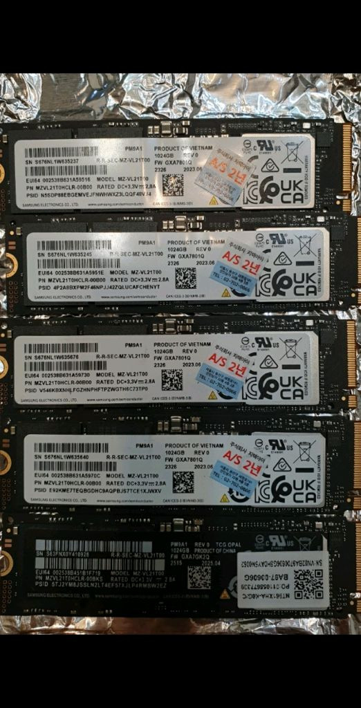 삼성 SSD PM9A1 1TB 외/980 프로 oem /국내정품 삼성 PM9A1 SSD 512GB, 1TB,/ 980 프로 500GB 작동 잘됩니다. 23년 6월,10월 제조 이구요 상태 좋구요 사용시간 적습니다 980 프로랑 동일한 성능이라 속도 빠릅니다 1개당 가격 Pm9a1 1T 5개(사용시간 0,0,1,16,19h) 개당 21만 pm9a1 512g 미사용 10개, 개당 16만 as남음 980 pro 500g 2개, 개당 17만(무상1년 남음) 택배는 편의점으로해 발송해드리고, 송장 보내드려요 직거래, 택배 둘 다 가능합니다. 대구 달성군 채팅 주세요 *이 게시글이 계속있으면 판매중입니다.