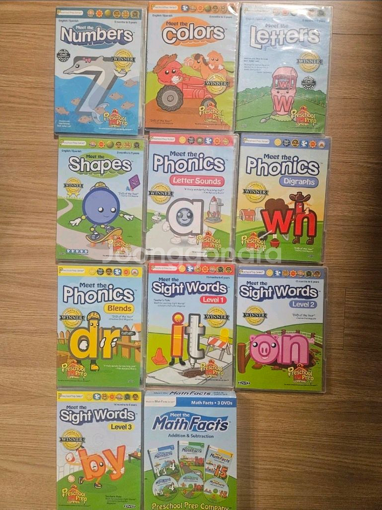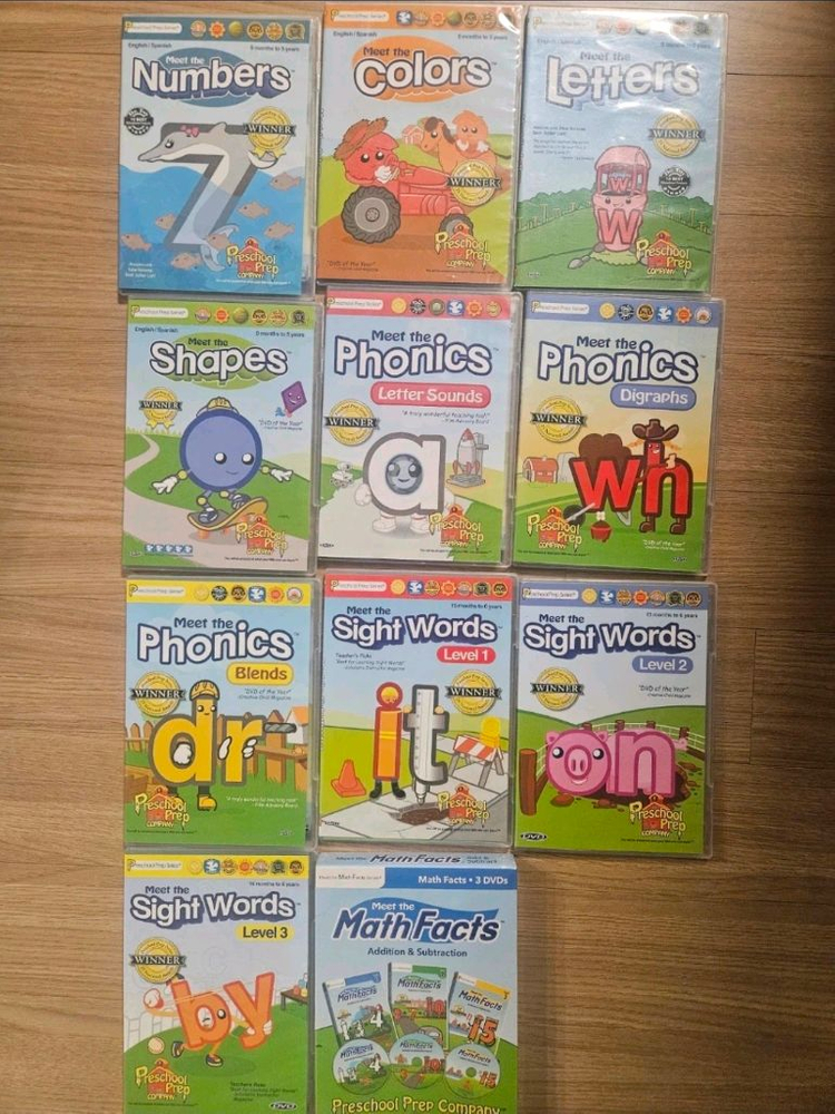 프리스쿨 프랩 DVD 풀세트 새제품입니다 - Meet the Numbers - Meet the Colors - Meet the Letters - Meet the Shapes - Meet the Phonics - Meet the Sight Words - Meet the Math Facts(3장.새상품) 모두 포함되어 있습니다