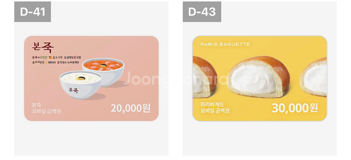 개인정보(거래정보)를 주고받는 행위는 사기에 노출될 수 있으므로 즉시 중고나라로 신고해 주세요본죽 20000 파리바게트 30000 함께구매시 45000 따로구매시 본죽 18000 파리바게트 28000