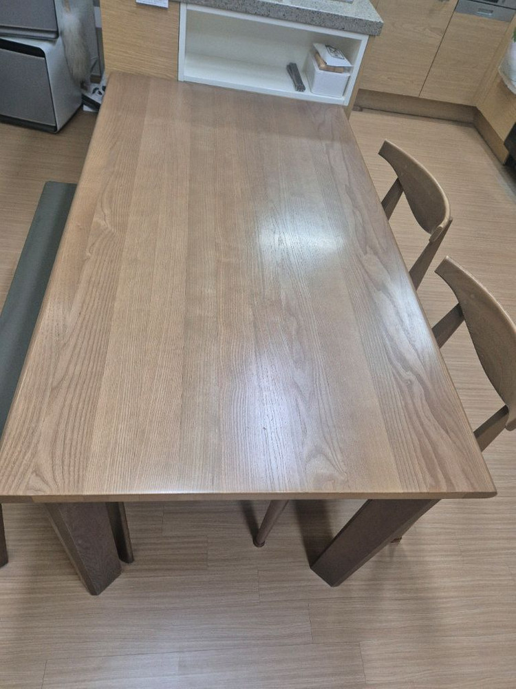 18년도 여름에 구매한 한샘 식탁입니다 의자는 먼저 판매 완료라 식탁만 판매해요 가로 140 세로 79 높이 75입니다 상판에 자연스러운 생활기스나 사용감 있지만 자연스러워요 서랍도 한 개 있어 유용해요~ 등받이 의자 밑에 제조년월 있어요