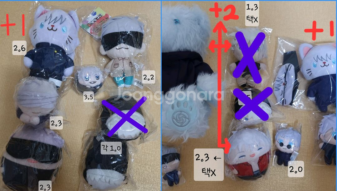 - 구매 전 아래 글 읽고 문의 - 윗치폼에서도 구매 가능합니다 - 중고나라 앱, 윗치폼, 번개장터에서만 판매하며 채팅으로 구매한다며 연락하고 타 사이트 유도, 문자 거래 유도 시 즉시 신고 및 차단합니다. - 구매 문의 외 답변❌ - 이 상품 글의 세트 외 다른 주술 회전 굿즈, 고조 굿즈도 판매 중입니다 - 주술회전 고죠 후와 특전, 고죠 후와, 고죠 점페, 고죠 베어, 고죠 네코 누이 등 공식 고죠 누이, 고죠 솜 등 고죠 솜 일괄 양도합니다. - 2~3번째 사진 속 X표시 제외 고죠 굿즈 일괄 급전으로 당분간 마지막으로 금액 낮춰 일괄 120,000원에 양도합니다 (포장비 1,600원 별도) - 개별 시 포장비는 700원~1,200원 / 일괄 시 포장비 1,800원 별도(뽁뽁이 등) - 배송비 별도, 환불 불가 - 개별 구매 시 사진 속에 표시된 금액으로 양도합니다 - +숫자만큼 추가하셔야 구매 가능. ㄴ +표시된 것끼리는 추가 불가능 ㄴ + 표시가 없는 거에서 + 개수만큼 추가로 구매하셔야 구매 가능. - 빠른 양도 위해 구매 금액 최소 30,000원 이상부터 거래 - 사진 속 굿즈 금액 단위는 1.0=10,000원입니다 - 고죠 1탄 후와 특전 (오키나와 특전X)은 개봉 후 세탁o, 택X. 봉투에 넣어 서랍장 보관하였으나 시간이 오래 지난 점 참고하여 구매바랍니다 - 2번째 사진은 일괄 미개봉 - 3번째 사진 누이&솜들은 개봉 후 비닐만 교체하여 보관했습니다. - 3번째 사진 속 덤인 푸치누이와 4번째 사진 속 가방은 일괄 구매시 덤으로 드립니다 - 세트별 금액별로 5번째 사진 속 굿즈 3~4개 덤으로 드립니다(소진 시 발송X) - 100,000원 이상의 세트별로 양도 중인 고죠 세트들 중 한세트 이상 구매 시 마지막 사진 속 주술회전 쥬쥬페스 고죠 티켓과 주술회전 회옥 옥절 OP CD 덤으로 드립니다(선착1명.소진 시 발송X)→ CD는 미사용. 구성 중 빈공간의 스티커?굿즈는 X - 거래 도중 파기는 사양합니다. 환불 불가, 찔러보기 ❌, 네고 ❌ - 배송기사님이 물건을 인수하신 이후에 문제 발생 시 택배사에 직접 문의 부탁드립니다. (배송 중 파손 발생, 물건이 다른 지점으로 갔다, 미도착)