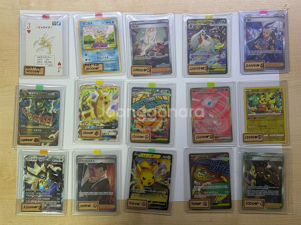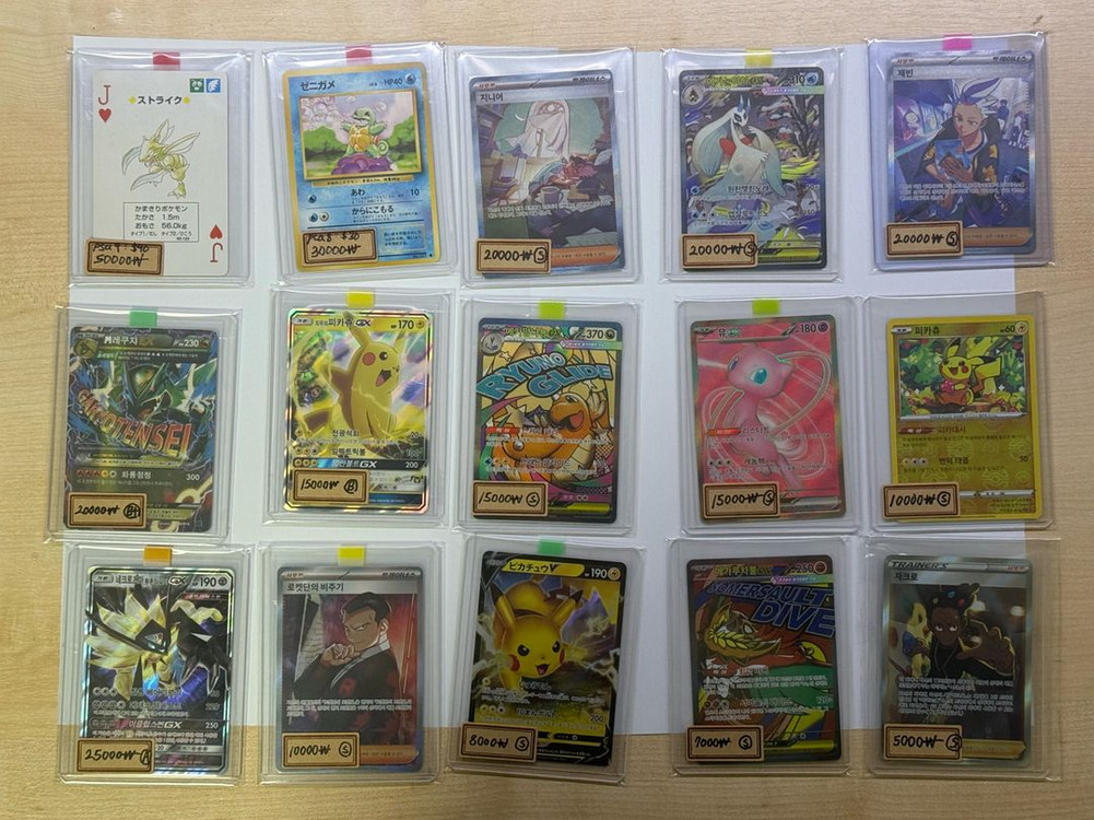 현재 시세보다 20~40% 싸게 판매합니다. 카드 좌측하단에 카드 가격과 엄격한 상태등급(B~S) 나와있습니다. 사진 좌측 상단 초판 1996 카드들은 psa앱을 통해 등급을 매겻습니다. ebay 등카 가격보다 싸게 드립니다. 육안 상으로도 상태 좋습니다. 서비스도 드려요~ 편하게 문의주세용 ‼️판매완료 - 1996 꼬부기 - 지우의피카츄GX 제 숍 둘러보시고 더 구매하시면 일괄 배송 가능합니다 * 슬리브+탑로더 처리완료 * 모든 일괄 20.5 * 편택2500, 택배가능 (편택 2만원부터)