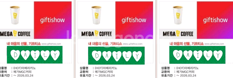 1400원 [메가커피] 핫 아메리카노 ×3장 (유효기간 : 2026.03.24) 결제후 바코드 바로 전송드립니다 동일 가격 이상 다른 상품으로 주문 가능, 차액추가지불 [사용처] 전국메가MGC커피 매장에서 사용 가능 단, 아래 매장은 매장 상황에 따라 쿠폰 사용에 제한 • 서울: 건대학생회관점, 동소문점, 강남역점, 여의도파크원 • 경기: 용인성복역점 • 울산: 홈플러스울산점 • 경남:김해롯데워터파크점, 김해공항국내선점 메가MGC커피 앱> 메인화면 내 [메가월렛] 선택 > [모바일 교환권 등록하기] 통해 매장 또는 메가오더에서 주문 시 사용 가능