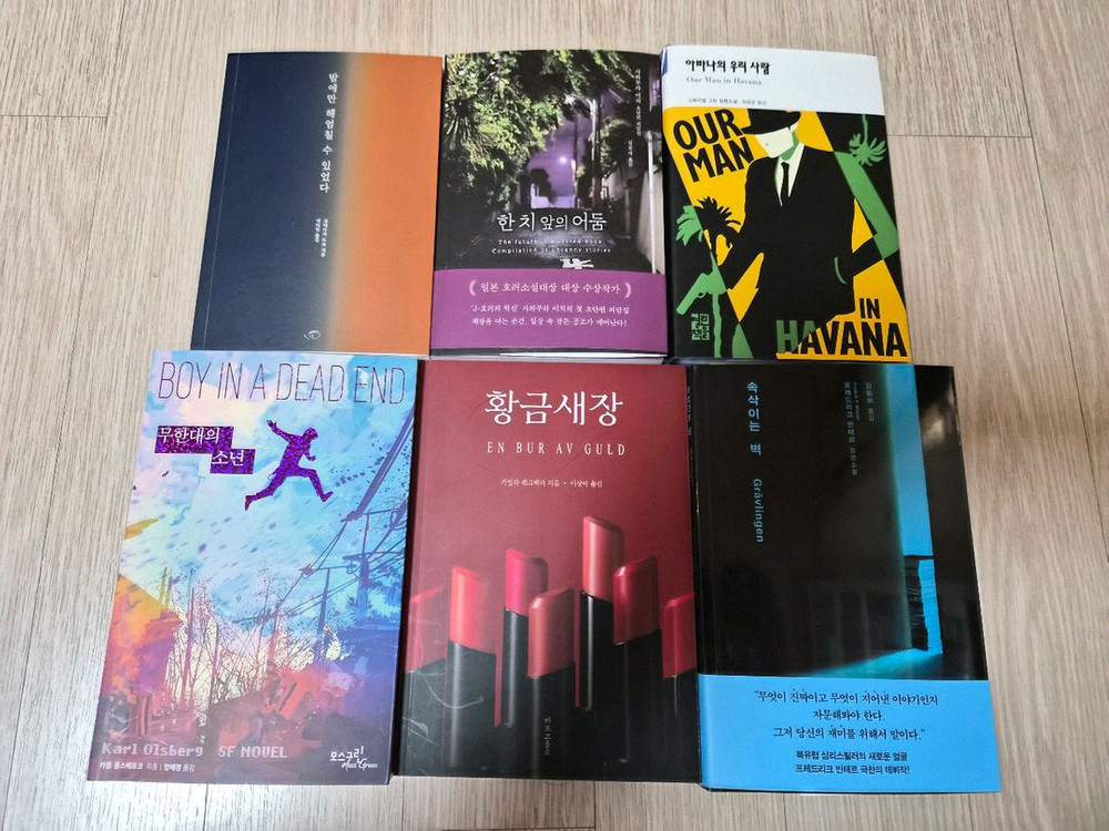 1. 밤에만 헤엄칠 수 있었다 - 고야나가 도코 2. 한치 앞의 어둠 - 사와무라 이치 3. 아바나의 우리 사람 - 그레이엄 그린 4. 무한대의 소년 - 카를 올스베르크 5. 황금새장 - 카밀라 레크베리 6. 속삭이는 벽 - 프레드리크 빈테르 구매해서 깨끗하게 읽었습니다. 희망하는 2~3권 지정해주시면 판매 가능하니 연락 주세요. 반값 택포 가격입니다.