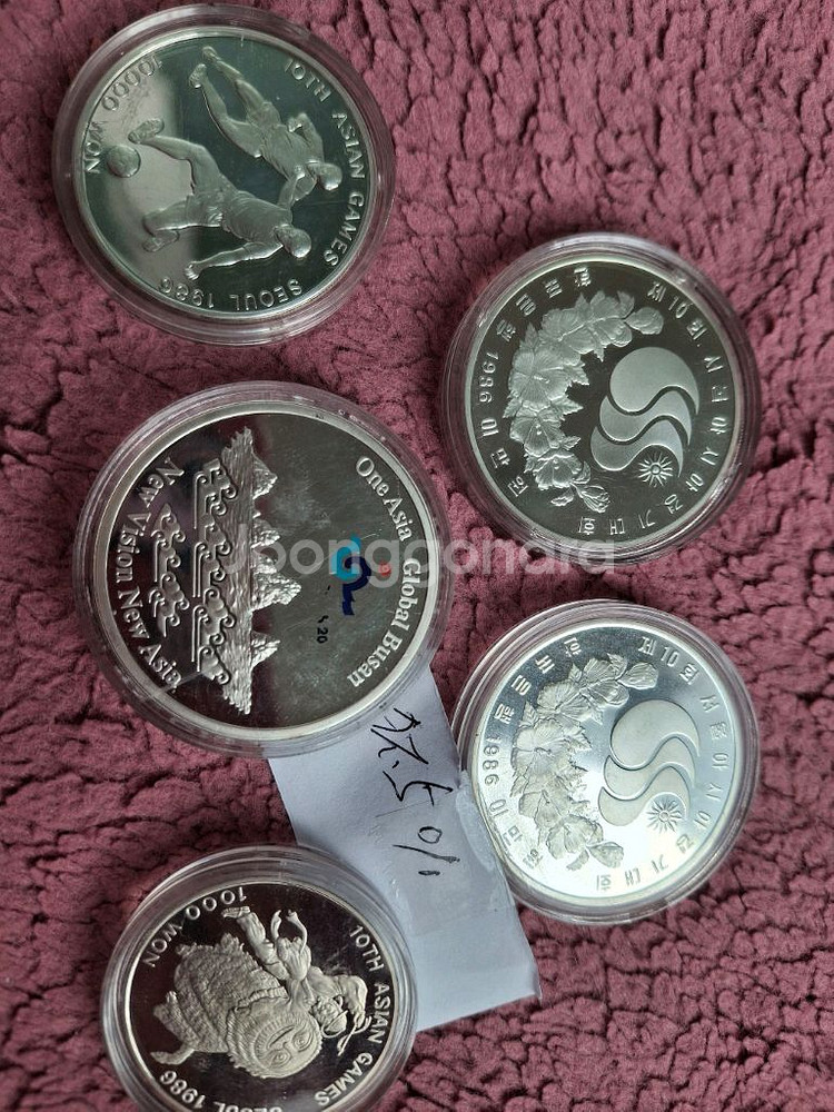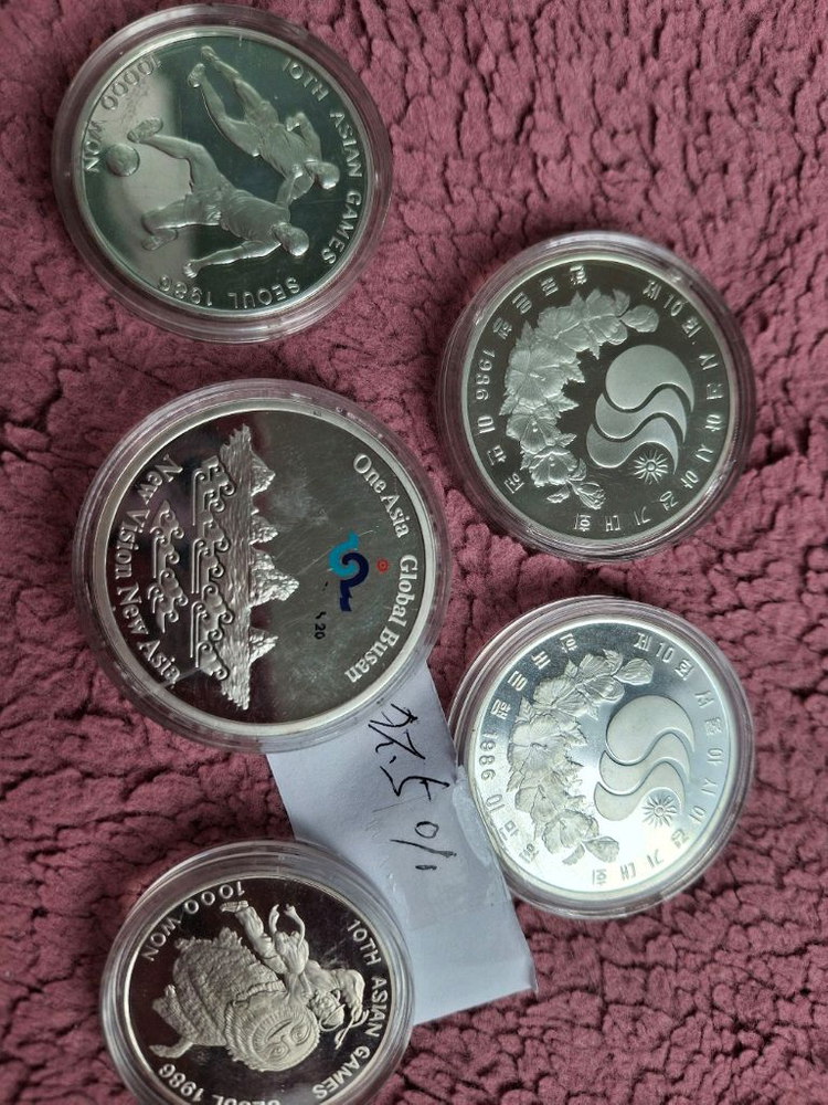 올림픽 기념 동전 5개 세트로 상태 양호해요. 각각 개별 보관되어 있어서 컬렉션용으로도 좋습니다. 실버 소재의 고급스러운 디자인이 매력적이에요. 은92.5%. 4개는.은화입니다. 1천원짜리는.덤으로 드려요.