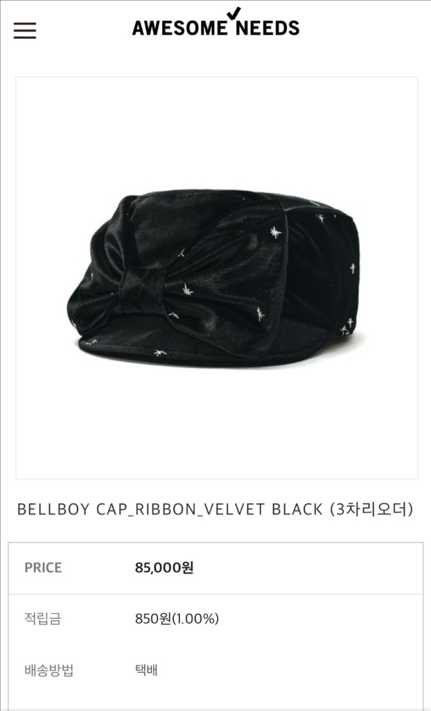 awesomeneeds 어썸니즈 신상 벨보이캡 리본 벨벳 블랙