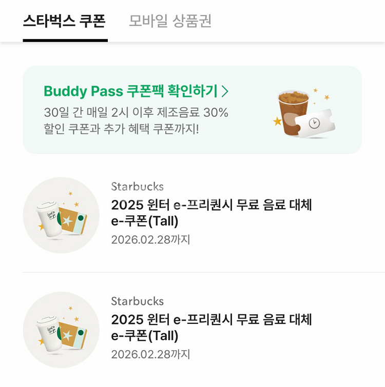 스타벅스 프리퀀시 대체 음료 쿠폰 1장당 4300원 스타벅스 매장에서 파트너가 제조한 음료 1잔(Tall) 가능합니다! 2/28까지 사용가능하고 선물하기로 보내드려요!