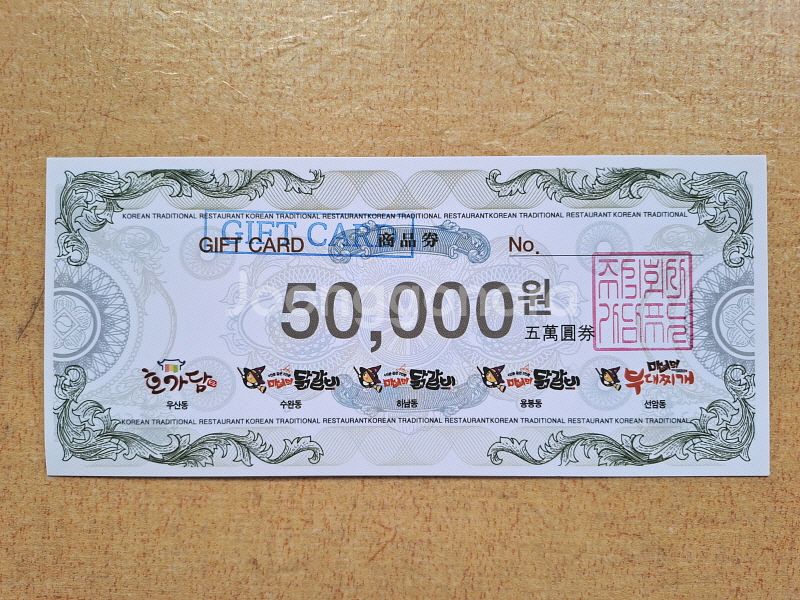 * 중고나라에서 사슴무 로 검색해 보시면 많은 판매내역 있고, 현재도 다양한 물품을 판매중입니다. 안심하고 구매해주세요. * 무료 택배배송하며 배송후엔 환불은 안됩니다. * 문자 주시면 채팅보다 답변이 더 빠릅니다. o l o 2 8 1 2. 7 4 2 1. ● 호가담, 마녀의 닭갈비, 마녀의 부대찌개 상품권 5만원권 --> 42,000원 1개 있습니다. 기간 없습니다(상품권에 기간 안나와 있습니다). 사용처 - 호가담, 마녀의 닭갈비, 마녀의 부대찌개 매장 - 본 상품권은 현금으로 교환되지 않습니다 - 현금영수증 및 세금계산서가 발행되지 않습니다