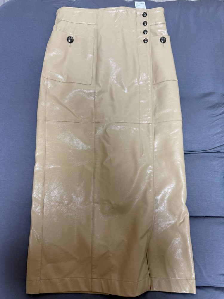 은은한 광택이 도는 오브제 베이지 레더 롱 스커트입니다. 앞쪽에 있는 포켓 디테일과 버튼 디테일이 포인트입니다. 독특한 디자인이라 소장 가치 있어요. 문의 없으시면 바로 안전결제해주시면 됩니다! 사이즈 작아서 판매합니다 3번입고 보관만 한 상태 총기장 86 엉덩이 단면 43 64-94
