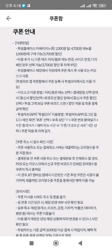 오늘까지 kt 투썸 아메리카노 1000원 쿠폰