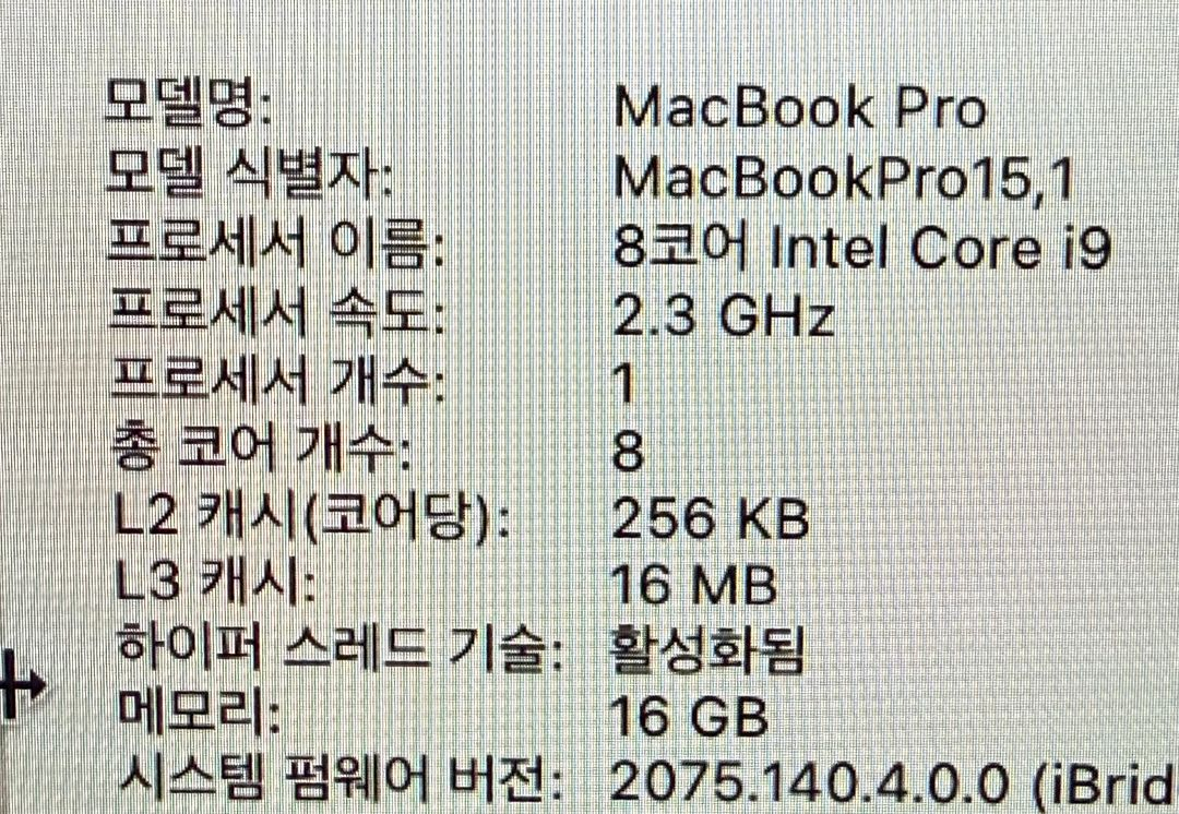 맥북 프로 15인치 2019년형 intel core i9 16GB RAM 512GB SSD 배터리 사이클 149 정품 87W 충전기 및 정품 케이블 포함. 전반적으로 상태 깔끔한 편이나 카메라 상단 고무패킹쪽 사용감과 하판에 스티커자국 있습니다. 필요하신 사진 있으면 더 보내드릴게요. 성남 판교, 고등동 인근 직거래를 선호합니다.