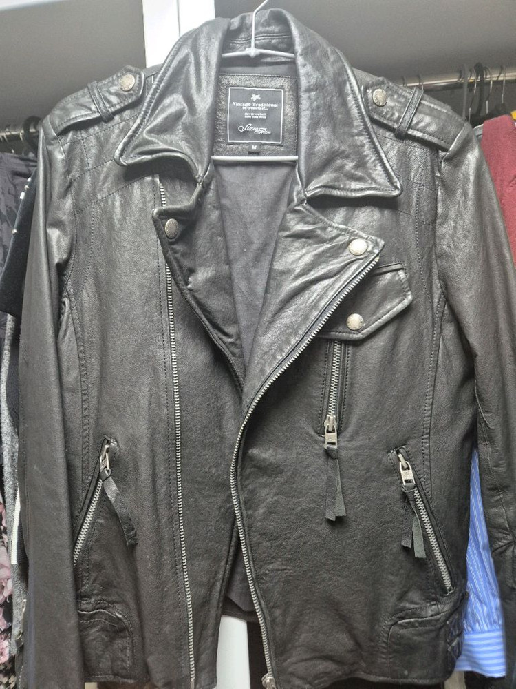 6to5 빈티지 양가죽 라이더 가죽자켓입니다. 사이즈 M 어깨 약 43cm 가슴둘레 약 95cm 총장 약 59cm 100%양가죽 자켓이고 전체적으로 상태 좋은 편입니다. 관심있으신분은 연락바랍니다.