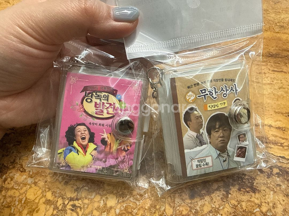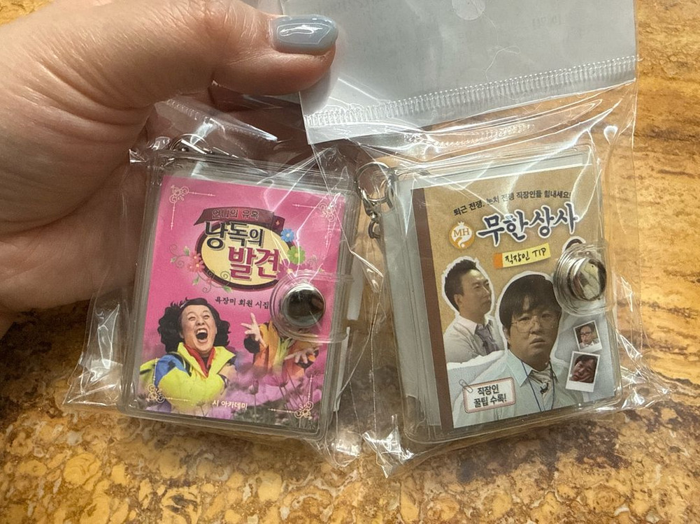 무한도전 미니북 키링입니다. 확인으로 개봉만 했습니다. 언니의 유혹, 무한상사 각각 1권에 15000원입니다.