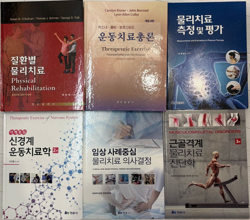 물리 치료 전공 서적 판매합니다! 밑줄 그은 부분 조금씩 있습니다! 질환별 물리 치료 (정가 90,000) = 70,000 운동치료총론 (80,000) = 65,000 물리 치료 측정 및 평가 (45,000) = 30,000 신경계 운동치료학 (45,000) = 30,000 임상 사례중심 물리 치료 의사결정 (38,000) = 25,000 근골격계 물리 치료 진단학 (48,000) = 35,000