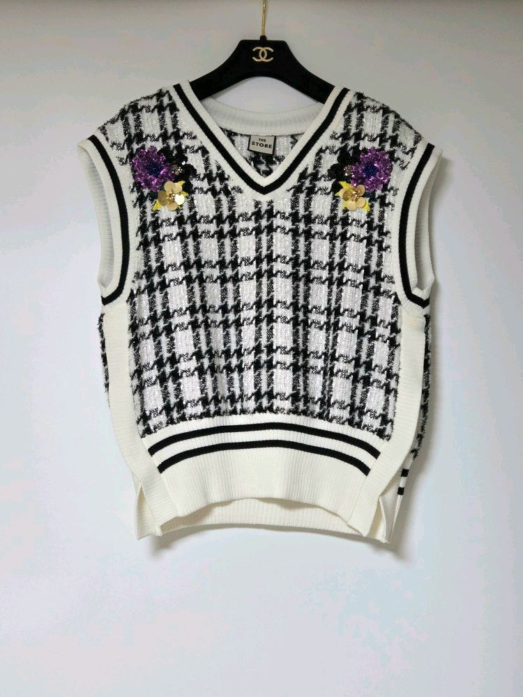 화사하고 유니크한 한섬 폼더스토어 THE STORE 시퀸 비즈 장식 니트 베스트 2020년 매장에서 구입한 초판 품번 소재 폴리에스터 99, 기타 섬유 1% 택 기재 S사이즈, 82-94-160으로 실측 가슴 반품 49, 기장 59cm 시퀸(비즈)로 된 플라워 장식이 멋진 제품