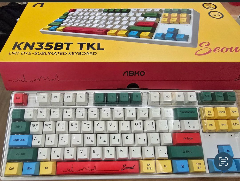 앱무무 KN35BT 서울에디션 풀박스입니다! 키보드가 많고 키캡 교체해서 사용감 적습니다! 첫번째 사진: 원래 키캡 (90,000원) 두번째, 세번째 사진: 변경 키캡 (10,000원) 키캡 선택 가능합니다!