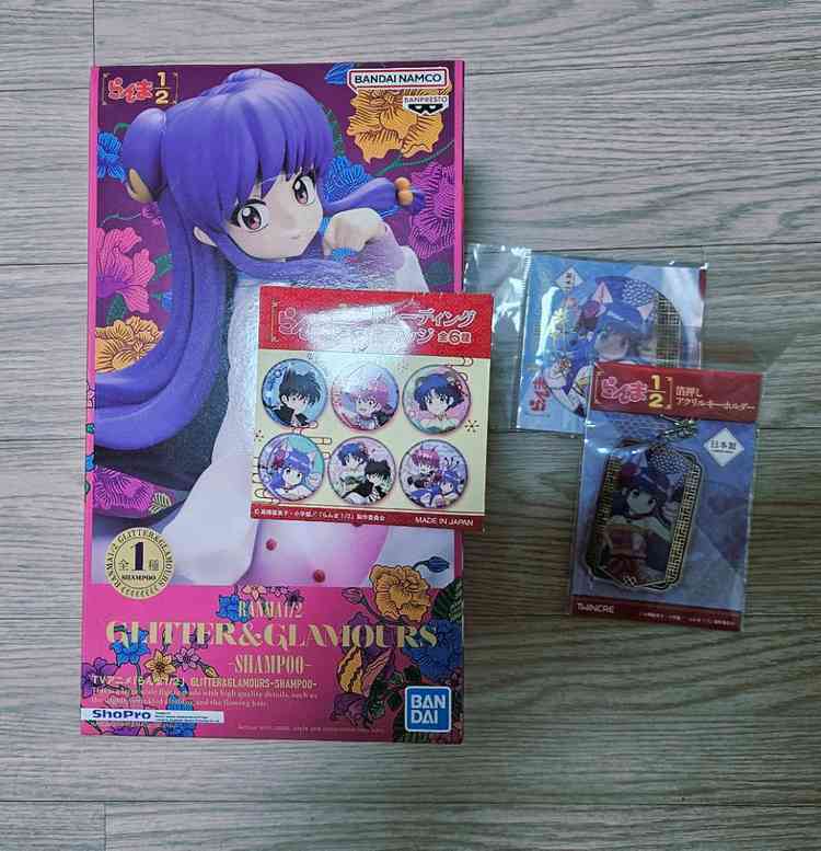 란마 1/2 샴푸 반프레스토 피규어+부적 아크릴 키링 캔뱃지 + 란마 뱃지 개봉품 판매합니다 피규어 하자없고 피규어 박스 안에 완충하는 박스 없습니다. 키링이나 캔뱃지도 개봉만 하고 하자 없었어요 랜덤뱃지는 남자란마입니다.
