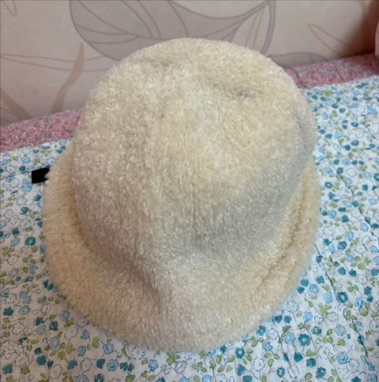 따뜻한 양털 소재의 크림색 버킷햇이에요. 부드럽고 포근한 질감으로 겨울철 착용하기 좋습니다. 한 번 착용해서 상태 매우 양호하고 실용적인 아이템입니다.