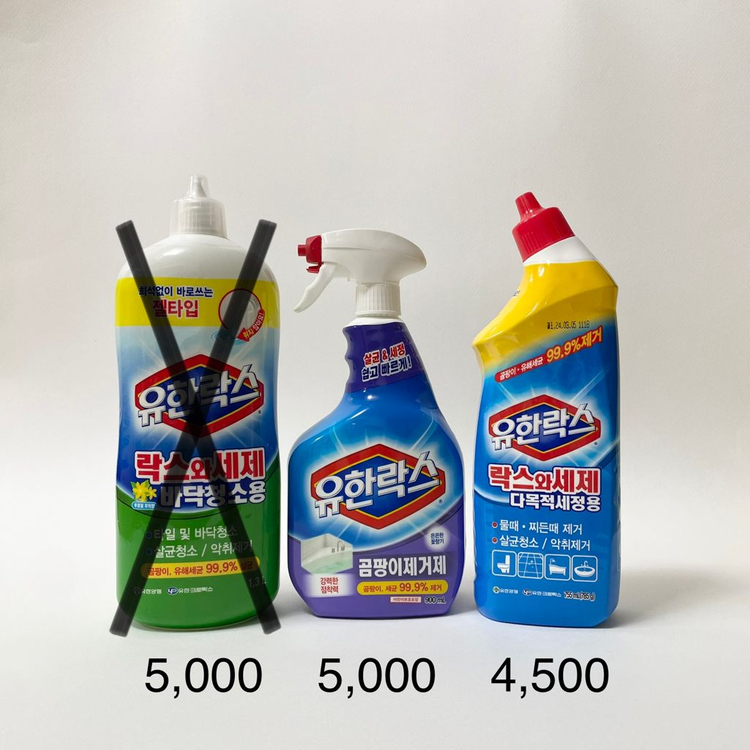 ❗️상품설명 미확인으로 인한 불편사항은 판매자가 책임질 수 없습니다. [미개봉] 유한락스 / 곰팡이제거제 락스와세제 다목적 청소용품 욕실 주방 부엌 청소 다용도 싱크대 ✔️ 전부 미개봉 새상품 🧼 [판매완료] 유한락스 락스와세제 바닥청소용 1.3L * 1개 - 제조연월일 2024.01.17 - 5,000원 🧼 유한락스 곰팡이제거제 900ml * 1개 - 제조연월일 2024.03.26 - 5,000원 🧼 유한락스 락스와세제 다목적세정용 755ml * 1개 - 제조연월일 2024.03.05 - 4,500원 🎁 모든 제품 서늘한 곳에서 암실 보관합니다! 📦 택배비는 무게에 따라 추가 발생할 수 있습니다. 📦 GS반택 2,700원부터 (분실/파손/미수령으로 인한 반송 시 책임 x) 📦 CU알택 2,500원부터 (분실/파손/미수령으로 인한 반송 시 책임 x) 📦 편의점택배 4,300원부터