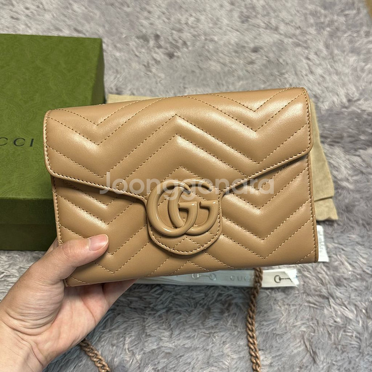 정가 200만원대의 제품으로, 핑크베이지 색상의 미니 체인백입니다. GG 로고와 체인 색상 모두 가방과 동일해 통일감이 있고 매우 예쁩니다. 사진에서 보시다시피 GG 로고에는 까짐이 전혀 없습니다. 모서리 한쪽에 초미세한 까짐이 있으나, 전체적으로 상태가 매우 좋습니다. 구성품 다 있습니다. 연락주세요.