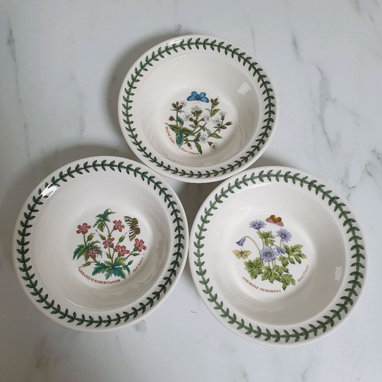 지름과 깊이가 적당해서 쓰임새 다양한 오트밀볼 3총사입니다. 국물 음식에 적합하여 오트밀.시리얼. 국.스프외 밥과 일반 반찬도 가능해요. 바닥이 평평해서 안정감이 있으며 용량도 제법됩니다. 오트밀볼은 사진보다 실물이 훨씬 이쁜 아이예요. 아시죠?~ 흰꽃과 분홍꽃 두개는 새상품이고 보라꽃 하나는 세컨핸즈입니다. .지름/16.5 .높이/5 .잉글랜드
