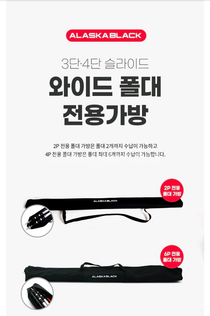 캠핑용 알래스카블랙 와이드 폴대 전용 가방 2개 팝니다. 슬라이드 폴대 수납에 용이합니다. 2P 전용 폴대 가방으로 폴대 2개까지 수납 가능합니다. 2개 일괄 판매합니다