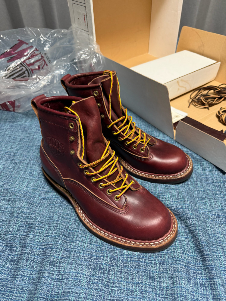 화이츠부츠 스모크점퍼 255사이즈 새상품입니다. 사이즈가 여유있게 나와서 레드윙 260 정도입니다. 버건디 색상의 크롬악셀 가죽이 고급스럽습니다. 여분 끈까지 있는 풀세트이니, 좋은 가격에 가져가세요.