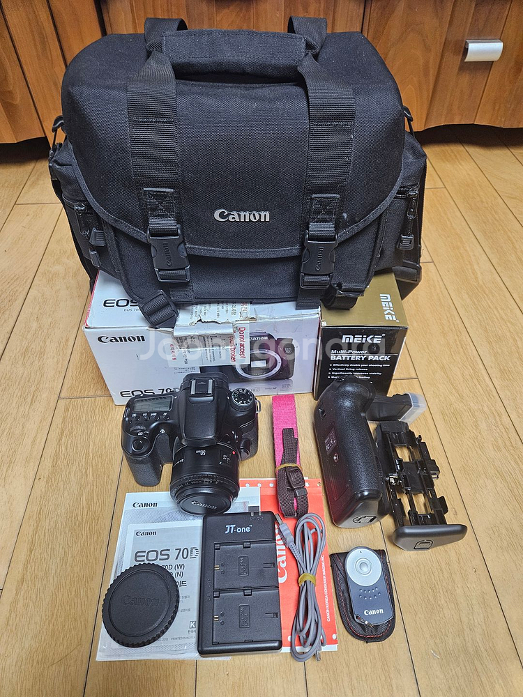 📸 캐논 EOS 70D + 50mm F1.8 + 세로그립 풀세트 판매합니다 * 바디: **Canon EOS 70D** * 렌즈: **Canon EF 50mm f/1.8 II** * 세로그립: **Meike MK-70D** 📦 구성품 * EOS 70D 바디 * EF 50mm F1.8 II 렌즈 * Meike 세로그립 (박스 포함) * 배터리 1개 * 듀얼 충전기 * 리모컨 * 케이블 * 정품 설명서 * 정품 박스 * 카메라 가방 * 스트랩 사진에 보이는 구성 전부 드립니다. ✔ 제품 상태 * 전원 및 촬영 정상 작동 * AF 정상 * 액정 깨끗 * 외관 생활기스 약간 있으나 큰 찍힘 없음 * 렌즈 곰팡이/뿌연기 없음 (깨끗한 편) 전체적으로 상태 좋은 편입니다만 컷수가 많은 관계로 저렴하게 판매합니다 묻지도 따지지도않은 조건으로 판매합니다 셧터박스 양호합니다 입문용 연습용으로 사용하시면 좋을것 같습니다 예민하신분 구매자재 해 주시기 바랍니다 ✔ 제품 특징 * 듀얼픽셀 AF 탑재 (동영상 AF 빠름) * 회전형 터치 액정 * Wi-Fi 지원 * 인물용 밝은 단렌즈 포함 (F1.8) 직거래 혹은 택배도 가능하며 택배시 환불어렵고 4000원 추가금 있습니다 직거래 지역은 대구입니다 안전거래 가능합니다