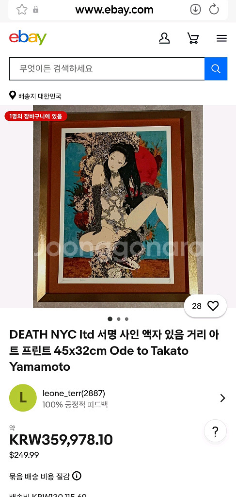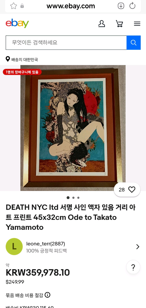 'DEATH NYC'는 뉴욕 출신의 스트리트 그래피스트. DEATH는 익명은 '쉽게 희망을 버리지 마세요 (Don’t Easily Abandon The Hope).'의 약자인 DEATH에서 따왔습니다. 현재 여러 명품 브랜드들과 협업하고 있습니다. 데스 NYC의 한정판 대형 서명 그래피티 팝 아트 프린트 판화. 고급 원목액자 제작 세로 59cm x 가로 46cm x 두께 4.3cm Yamamoto Takato의 Salome(2005)에 팝 아트 그래피티 배경 컬러가 에로틱하고 고어한 분위기를 자아낸 독특한 그림. 작품 감상에 방해되지 않도록 액자 뒤에 오리지널 스티커와 작가 서명 인증서를 따로 부착해 두었습니다. 이베이에서 다른 연번 액자가 36만원(항공료 제외)에 거래되고 있습니다. 유리액자입니다. 파손면책 동의 아래 택배배송합니다.