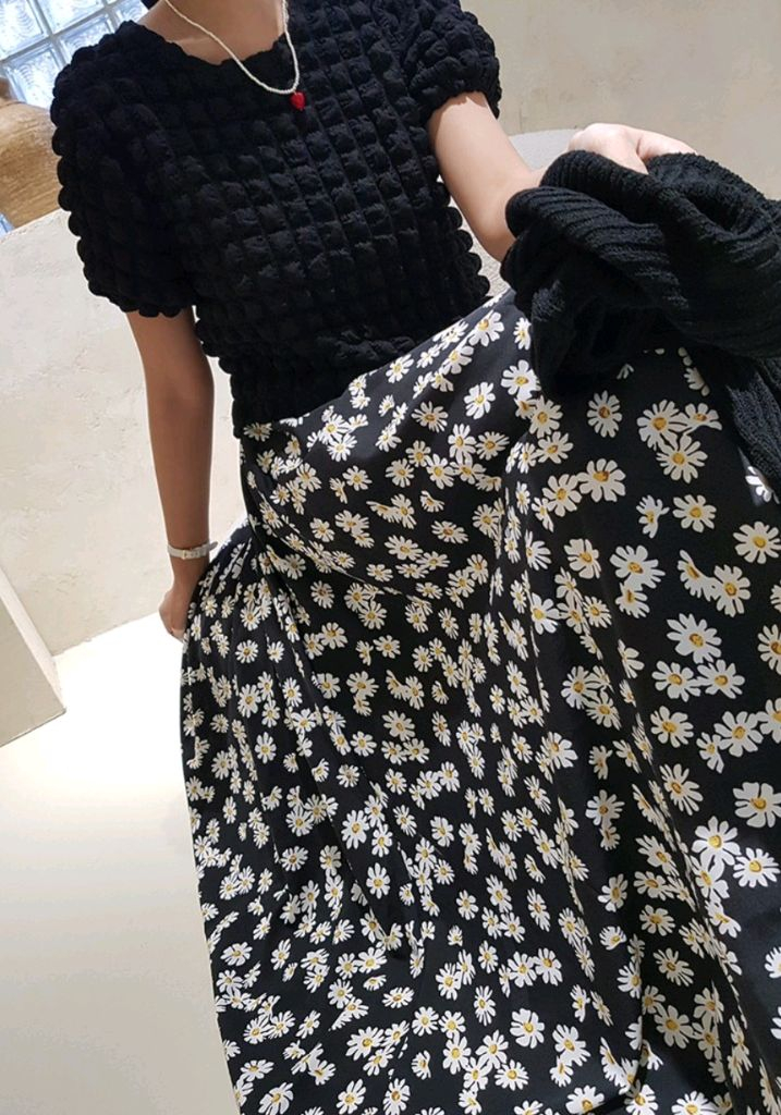 검정색 바탕에 흰색 데이지 패턴이 있는 롱 스커트입니다. 프리사이즈(55~77사이즈) 안감없음.키160이상추천. 3회미만 착용후 드라이완료. 허리 밴딩으로 되어있어 편안하게 입을수 있어요. 플라워 패턴이 포인트라 봄에 가디건이나 셔츠에 코디하기좋아요. 택배거래,직거래 모두가능