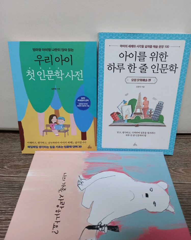 아이를 위한 인문학 관련 책 3권을 일괄 판매해요. 아이들 인문학 교육에 좋은 책들로 상태 양호합니다. (AI작성) *3권 *밑줄 찢김 없고 상태 양호합니다 *일괄 택포 15000원 입니다 (롯데택배) - 우리 아이 첫 인문학 사전: 아이의 세계를 넓혀주는 인문학 단어 30개가 담겨 있습니다 - 아이를 위한 하루 한 줄 인문학: 아이의 시각과 세계를 예술 문장으로 표현하는 100가지 문장이 수록되어 있습니다