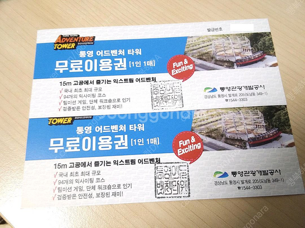 [팝니다] 통영 어드벤처 타워 2매 정가: 38,000원입니다 배송비무료 판매가: 18,000원 -정문바로입장 입금당일, 택배 발송하여 드립니다 *현재 판매중 입니다 판매완료되면 게시글 삭제합니다