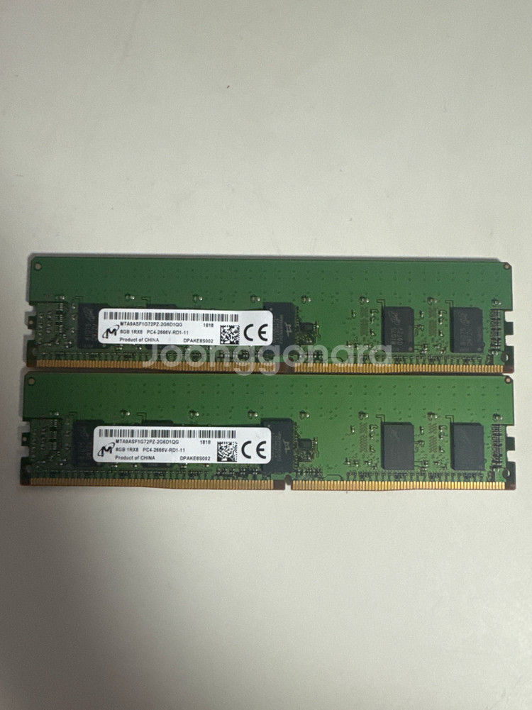 DDR4 8GB 데스크톱 램 판매합니다. 서버용 램이고, 수량은 2개 판매가는 개당 40,000원입니다. 제품명 : PC4-2666V-RD1-11