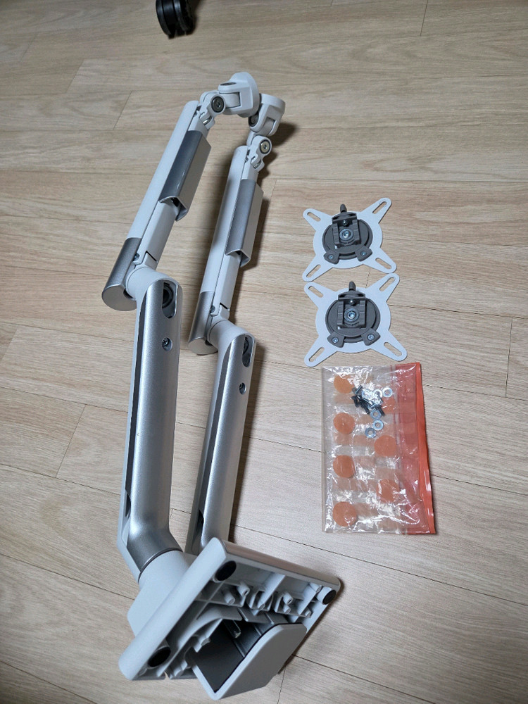루나랩 모니터암 판매합니다 흰색과 은색 조합으로 깔끔하고 모던한 디자인이 돋보입니다 - 모니터암 본체, VESA 마운트 2개, 부속품 포함되어 있습니다 튼튼하고 안정적인 지지력을 제공하여 안심하고 사용할 수 있습니다 모니터를 공중에 띄워 공간 활용도를 높여줍니다